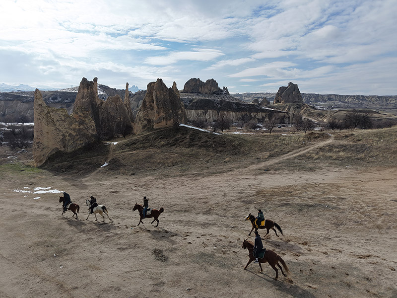 Kar yağışıyla beyaza bürünen Kapadokya’da peri bacaları ve vadiler masalsı görüntüler sunarken, son yıllarda ilgi gören at safarileri bölgenin doğal ve tarihsel kimliğini bir kez daha öne çıkarıyor.