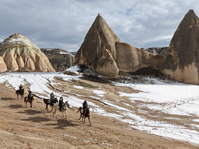Beyaz örtüyle kaplanan peri bacaları ve vadiler hem yerli hem de yabancı ziyaretçilere masalsı görüntüler sunarken, son yıllarda ilgi gören at safarileri bölgenin görsel zenginliğini daha da ön plana çıkarıyor.