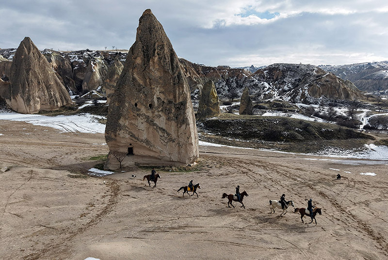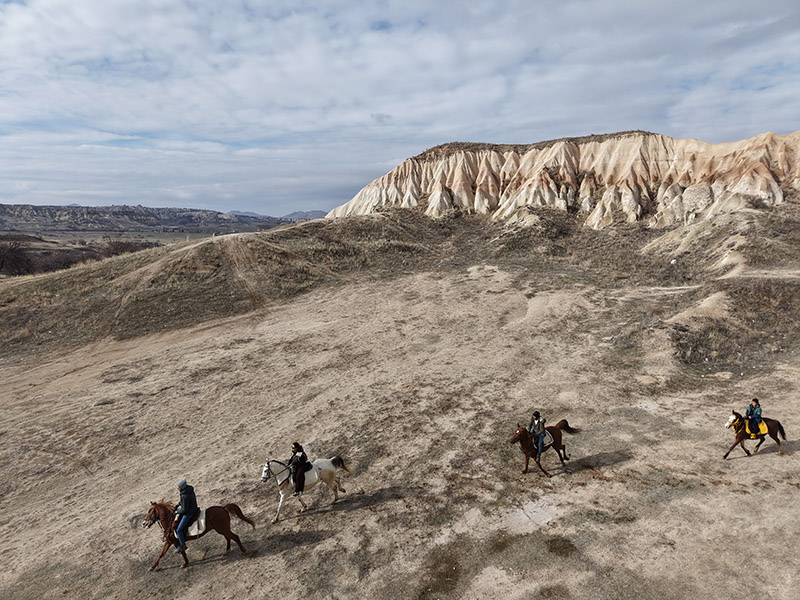 Peri bacaları ve vadiler arasında ilerleyen atlı gruplar, ziyaretçilere bölgeyi doğayla iç içe ve farklı bir perspektiften keşfetme imkanı sunuyor.