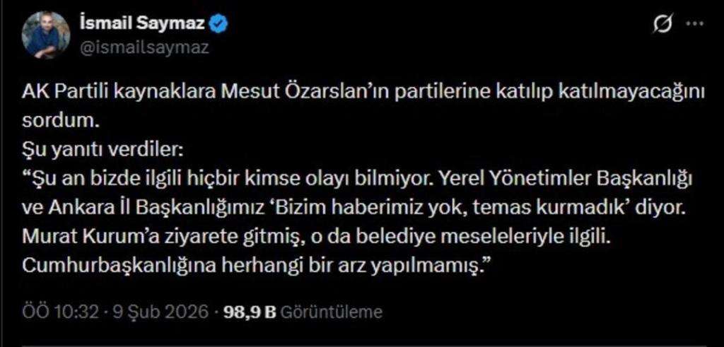 Saymaz, AK Parti kaynaklarıyla yaptığı görüşmede de, parti içinde bu yönde bir temas bilgisi bulunmadığını aktardı. Yerel Yönetimler Başkanlığı ve Ankara İl Başkanlığı’nın “temas kurmadık” dediği, Cumhurbaşkanlığı’na herhangi bir arz yapılmadığı belirtildi.