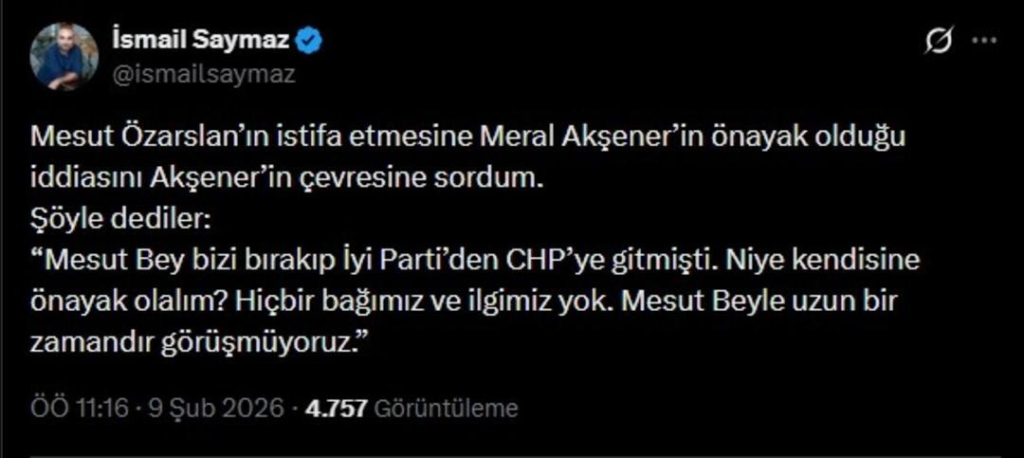 Öte yandan MHP kaynakları da Özarslan’ın MHP’ye geçeceği iddialarını net biçimde reddetti: “Böyle bir gündemimiz yok.”