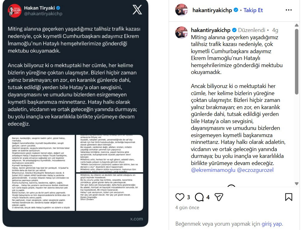 Bu arada Tirkayi, mitingin ardından sosyal medya hesabından yaptığı açıklamada da şu ifadeleri kullanmıştı: “Miting alanına geçerken yaşadığımız talihsiz trafik kazası nedeniyle, çok kıymetli cumhurbaşkanı adayımız Ekrem İmamoğlu’nun Hataylı hemşehrilerimize gönderdiği mektubu okuyamadık. Ancak biliyoruz ki, o mektuptaki her cümle, her kelime bizlerin yüreğine çoktan ulaşmıştır. Bizleri hiçbir zaman yalnız bırakmayan, en zor, en karanlık günlerde dahi, tutsak edildiği yerden bile Hatay’a olan sevgisini, dayanışmasını ve umudunu bizlerden esirgemeyen kıymetli başkanımıza minnettarız. Hatay halkı olarak adaletin, vicdanın ve ortak geleceğin yanında durmaya; bu yolu inançla ve kararlılıkla birlikte yürümeye devam edeceğiz.”