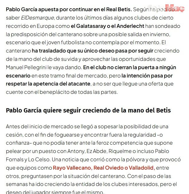 Real Betis yönetiminin, transfer döneminin son bölümünde kapıları tamamen kapatmadığı ancak tüm tarafları memnun edecek çok yüksek bir teklif gelmediği sürece oyuncunun kalma isteğine saygı duyacağı belirtildi. Oyuncu ve temsilcilerinin de 19 yaşındaki bir hücumcu için sabırlı olunması gerektiği görüşünde olduğu ifade edildi.